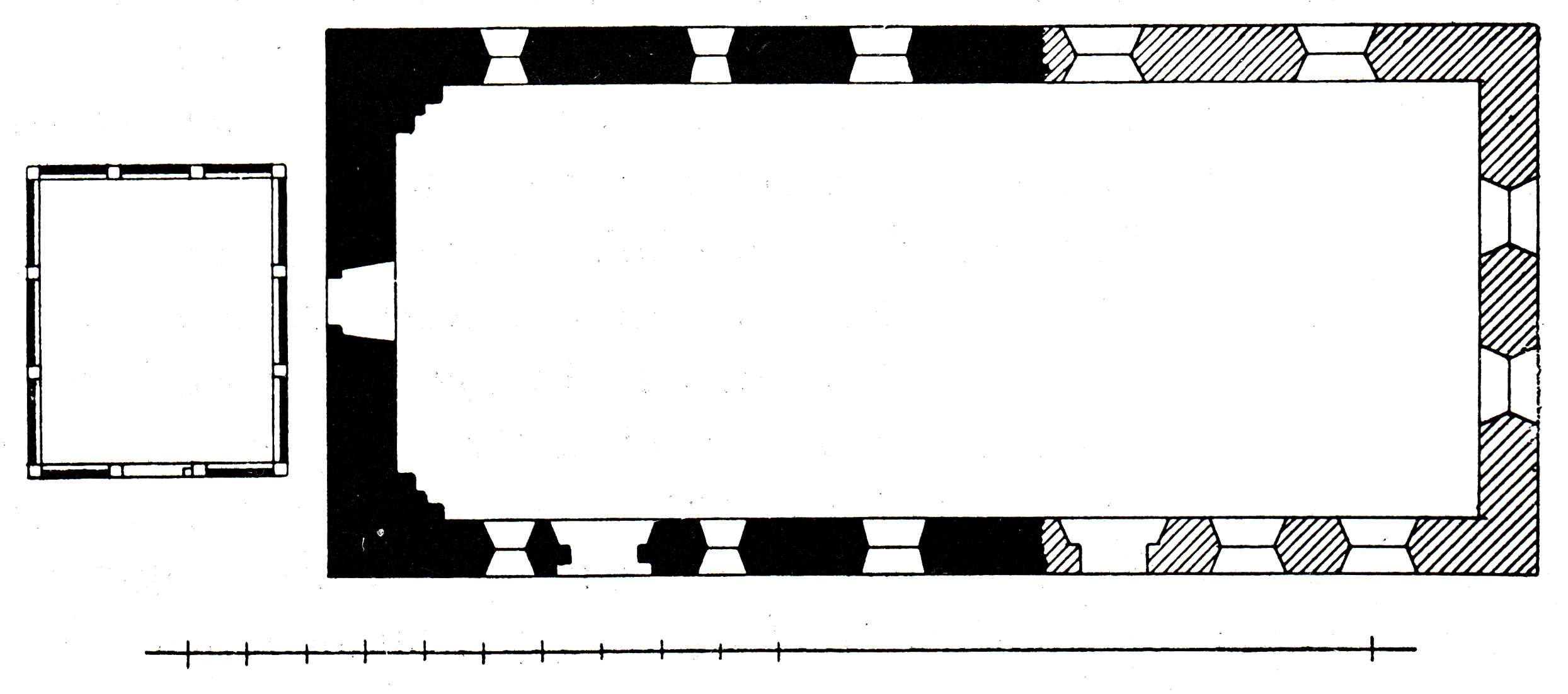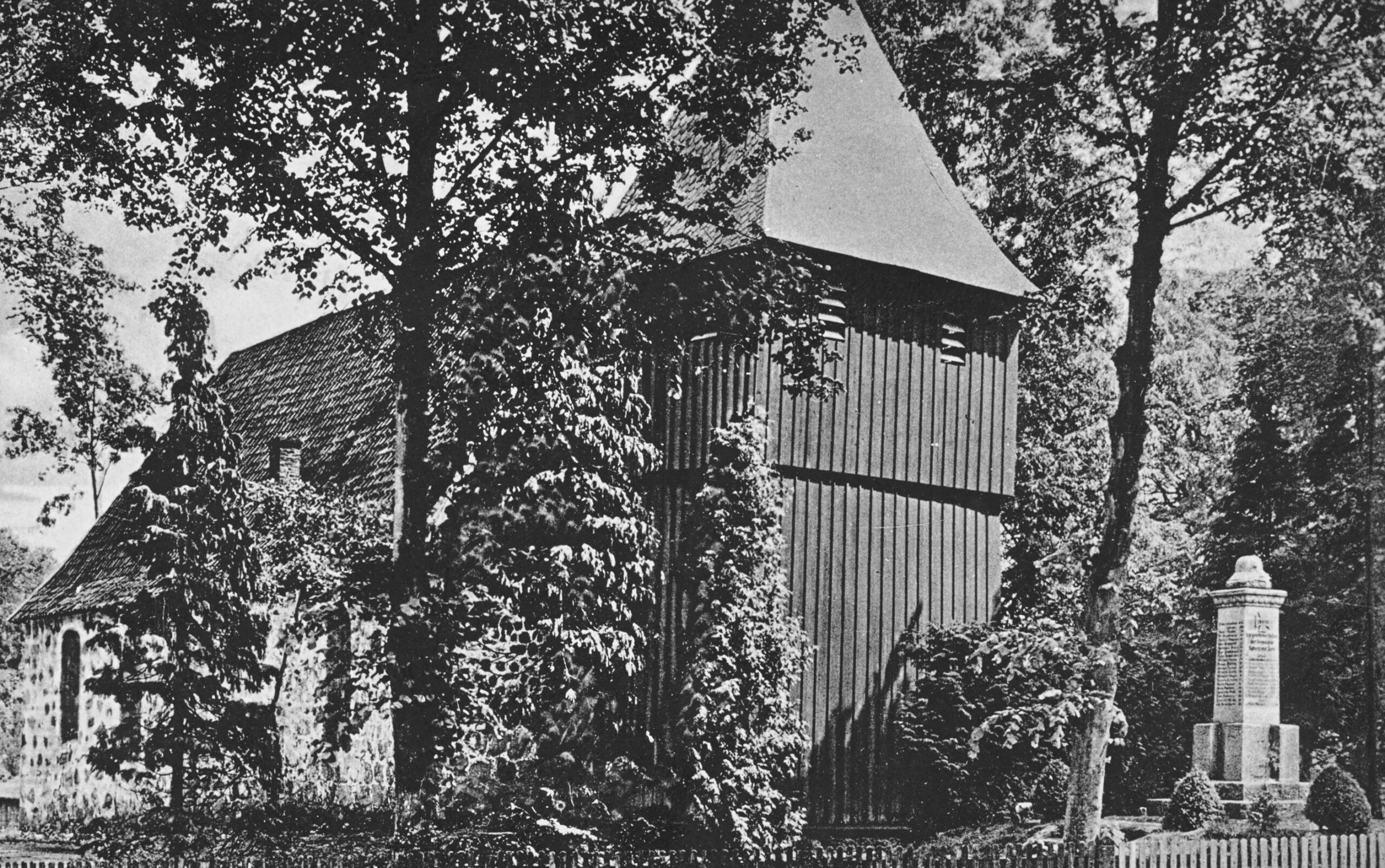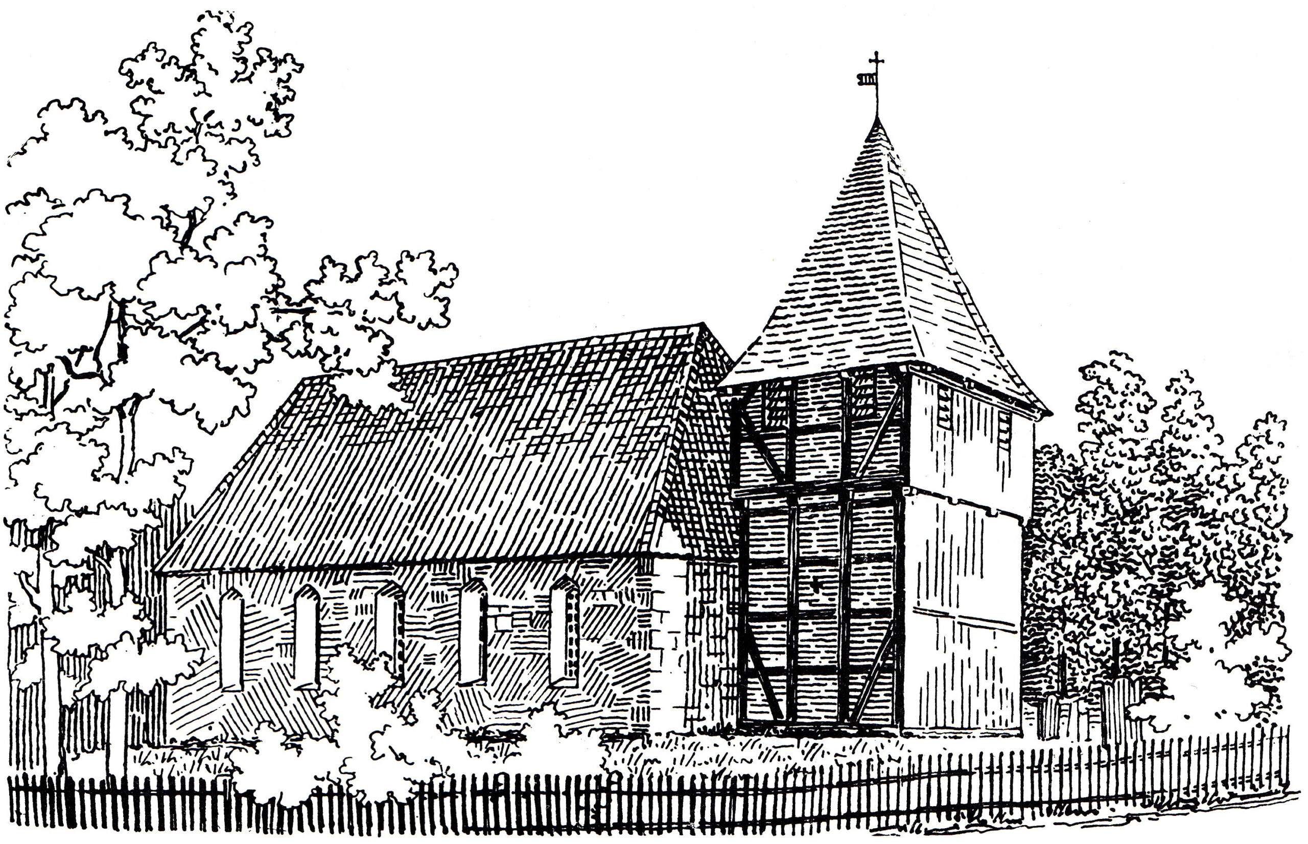 Rechteckiger Saalbau, ausgerichtet nach Ostsüdosten, Westteil erbaut vielleicht um 1200, Ostteil erbaut 1793.40 Walmdach. Feldsteinmauerwerk mit Backsteinausbesserungen. An den Längsseiten je fünf rundbogige bzw. segmentbogige Fenster, nach Osten zwei Segmentbogenfenster. Nach Süden zwei rundbogige Portale, nach Norden vermauerter Eingang. Im Innern flache Holzbalkendecke, im Norden, Osten und Süden auf abgetreppten Längsvorlagen; Westempore, Emporenbrüstung mit rundbogigen Füllungen, farbig gefasst, zwei Wappenmalereien (Familien von Marschalk und von Hammerstein), darunter Inschrift: „Einer ist euer Meister, Christus“; oben an der Nordwand Ausmalungsreste: geometrisches Muster (frühes 13. Jh.), Blattrankenfries (Ende 13. Jh.).41 Wohl um 1397/98 ursprünglich quadratische Kirche nach Osten verlängert, Halbrundapsis als Abschluss; gleichzeitig Kirche eingewölbt (Dendrodatierung des 1997 abgebrochenen Dachstuhls).42 Anfang 17. Jh. Südempore erbaut. Um 1695 Westeingang geschlossen (Bau des neuen Turms). 1707 Dachstuhl erneuert (vorhandene Hölzer wiederverwendet). 1787 Gewölbe teilweise eingestürzt, wohl 1788 abgebrochen und Holzbalkendecke eingebaut, Dach nach Osten und Westen abgewalmt. 1793–95 Umbau, u. a. Apsis abgebrochen und Kirche nach Osten verlängert. 1937 Renovierung. Herbst 1945 Reparaturen wegen Kriegsschäden. 1964 Renovierung, u. a. Ostempore und Kanzelaltarwand entfernt. 1997/98 Sanierung, u. a. Deckenhöhe vergrößert, Dachstuhl erneuert.