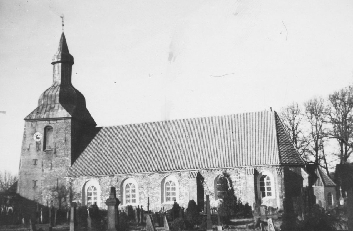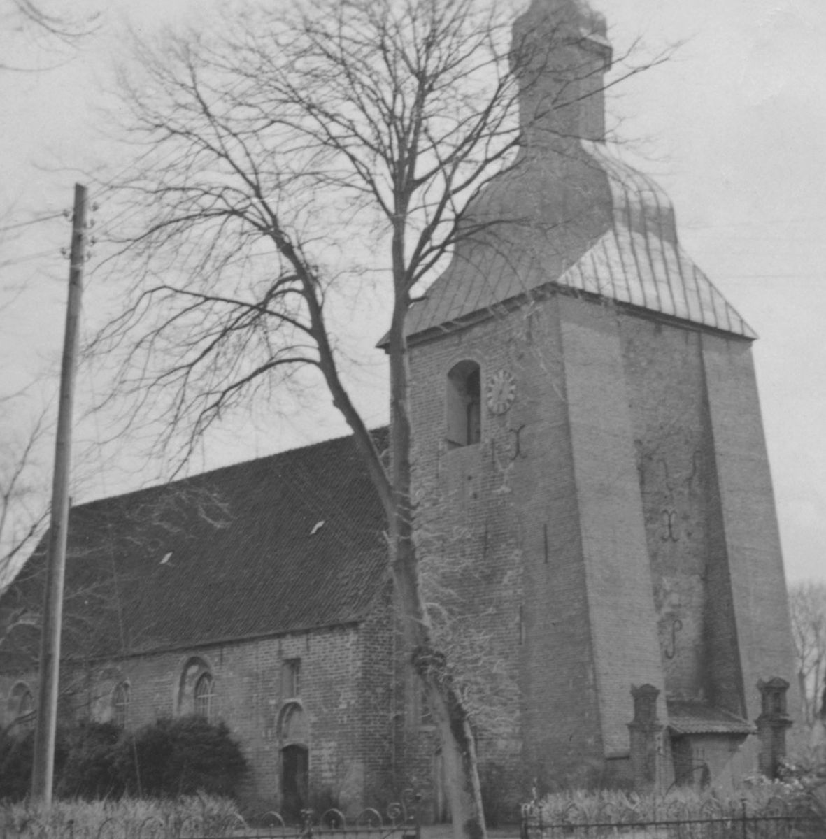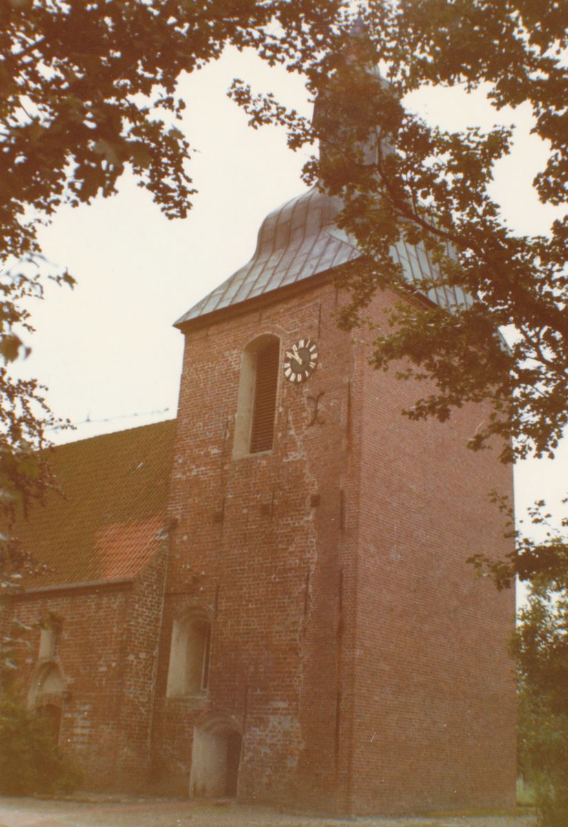 Niedriger, vierseitiger Westturm, erbaut zweite Hälfte 14. Jh. (angeblich 1371).47 Geschwungener Kupferhelm mit geschlossener Laterne, bekrönt mit Kugel und Hahn. Backsteinmauerwerk. Im Glockengeschoss je ein hohes, segmentbogiges Schallfenster nach Norden und Süden, westlich daneben jeweils Uhrziffernblatt. Nach Norden segmentbogiges Portal, links darüber Segmentbogenfenster. 1851 Turmhelm abgebrannt. 1908 Turm erneuert. 1911 Kupferdeckung (vorher Holzschindeln).48 1953/54 Instandsetzung.