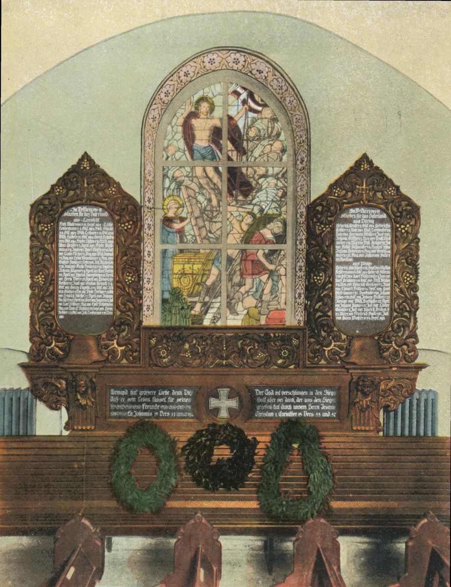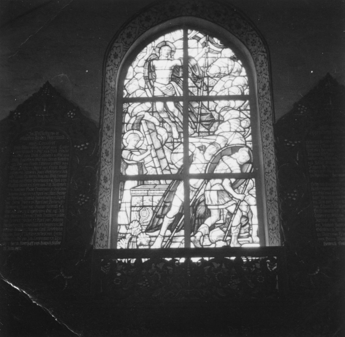 Figürliches Buntglasfenster nach Süden (1920, Franz Lauterbach, Hannover), Auferstehungsszene; 1992 restauriert.46