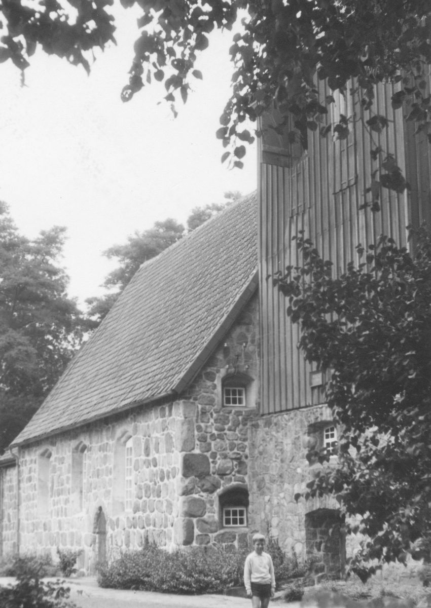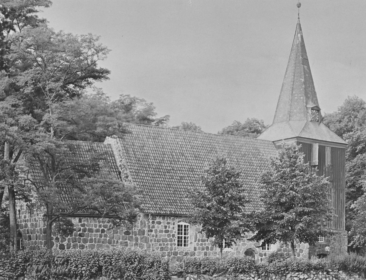 Romanische Saalkirche mit eingezogenem, etwa quadratischem Chor, Schiff im Kern 12. Jh., Chor 15. Jh. Satteldächer über Chor und Schiff. Lagerhaftes Feldsteinmauerwerk, Ostgiebel teilweise Backsteinmauerwerk. Am Schiff je drei große, segmentbogige Sprossenfenster nach Norden und Süden, nach Westen links und rechts des Turms übereinander je zwei kleine Segmentbogenfenster; am Chor ein großes, segmentbogiges Sprossenfenster nach Süden, ein kleines Rundbogenfenster nach Osten; Rundbogenportal nach Norden. Im Innern flache Balkendecke im Schiff, Kreuzrippengewölbe im Chor, runder Triumphbogen zwischen Chor und Schiff; im Chor Gewölbemalerei (Mitte 15. Jh., 1955/56 freigelegt und restauriert, 1990–92 restauriert), Weltgericht: im Osten Christus als Weltenrichter und Auferstehung der Toten, nach Norden Hölle, Teufel und Verdammte, nach Süden himmlisches Jerusalem, Petrus, Selige und Engel.33 Deckenbalken in der Mitte mit ornamentaler Bemalung (um 1830). 1825–31 Renovierung, u. a. Fenster vergrößert, Balkendecke bemalt. 1910 Renovierung. 1956 Renovierung. 1988/89 Renovierung, u. a. mehrere Deckenbalken ausgetauscht, ornamentale Bemalung wiederhergestellt bzw. erneuert.
