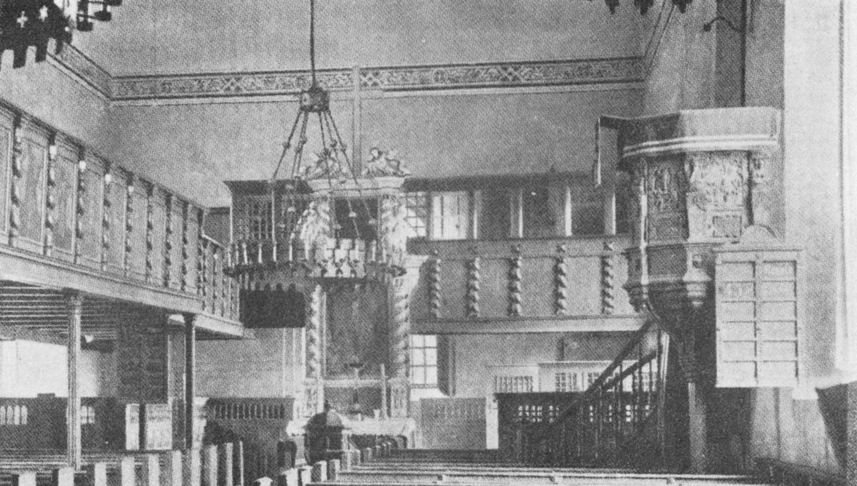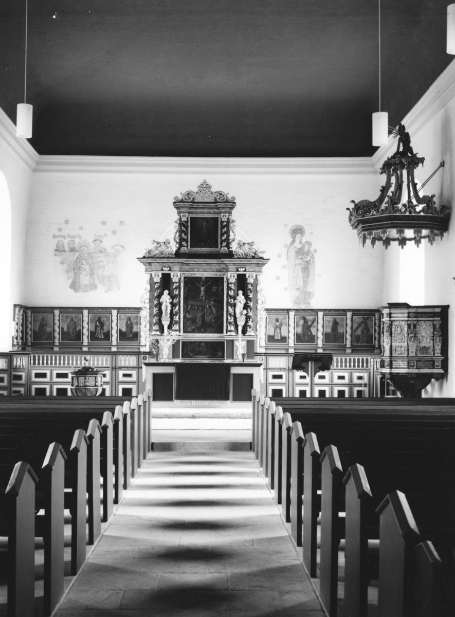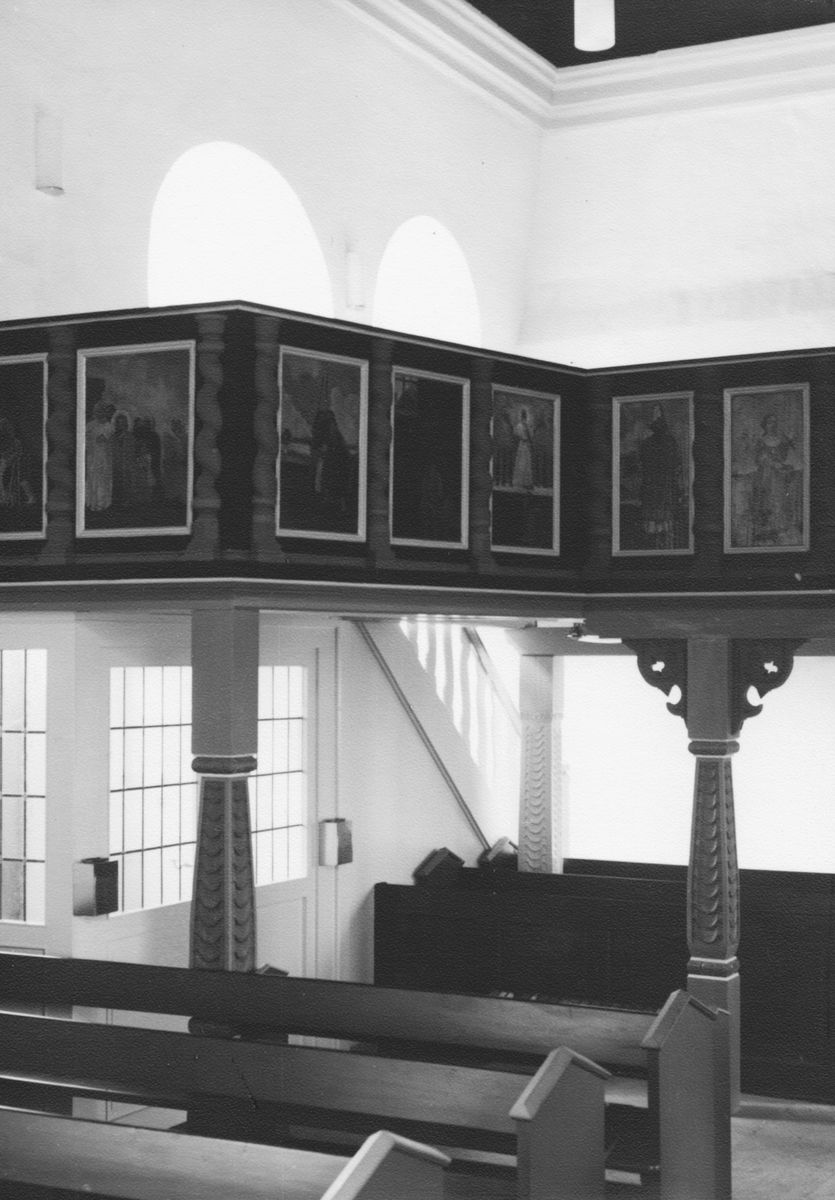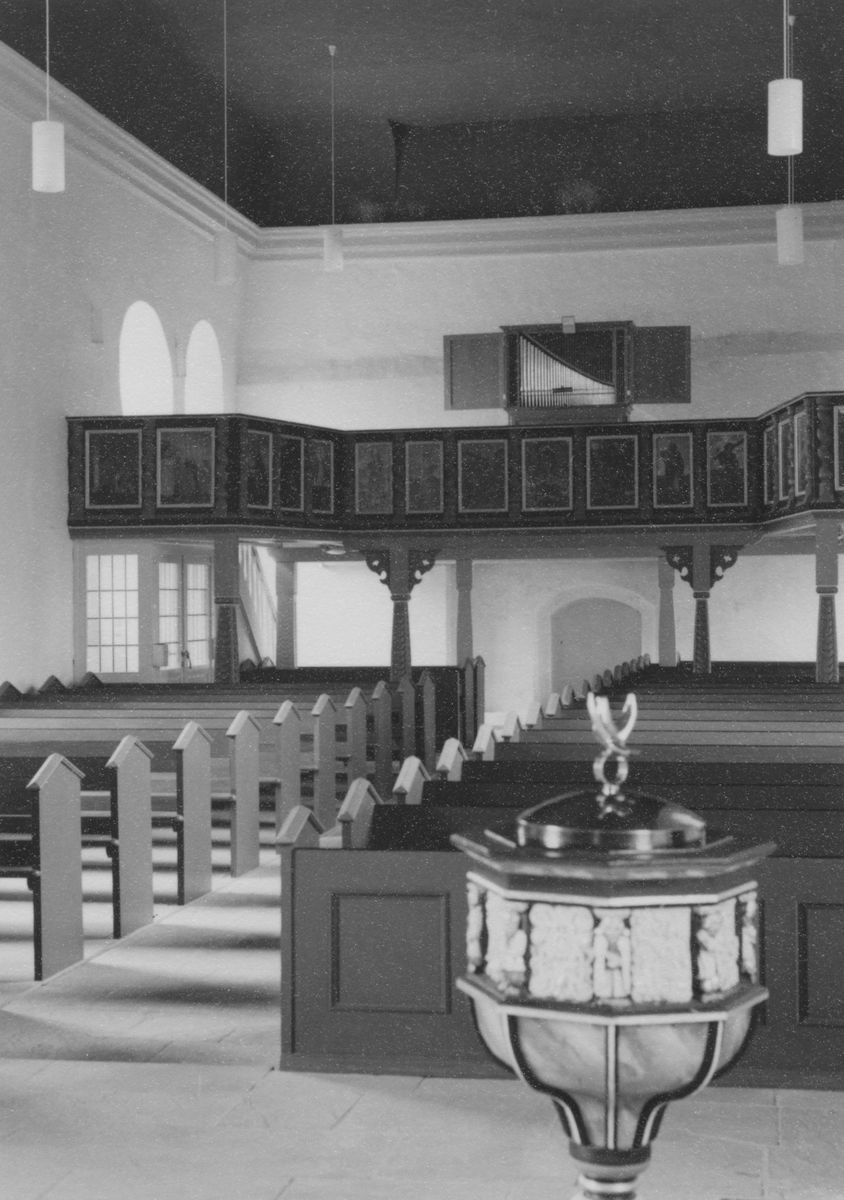 Kirche, Blick zur Empore, Teilansicht, an der Nordwand Stiftungstafel, Foto: Ernst Witt, Hannover, April 1963