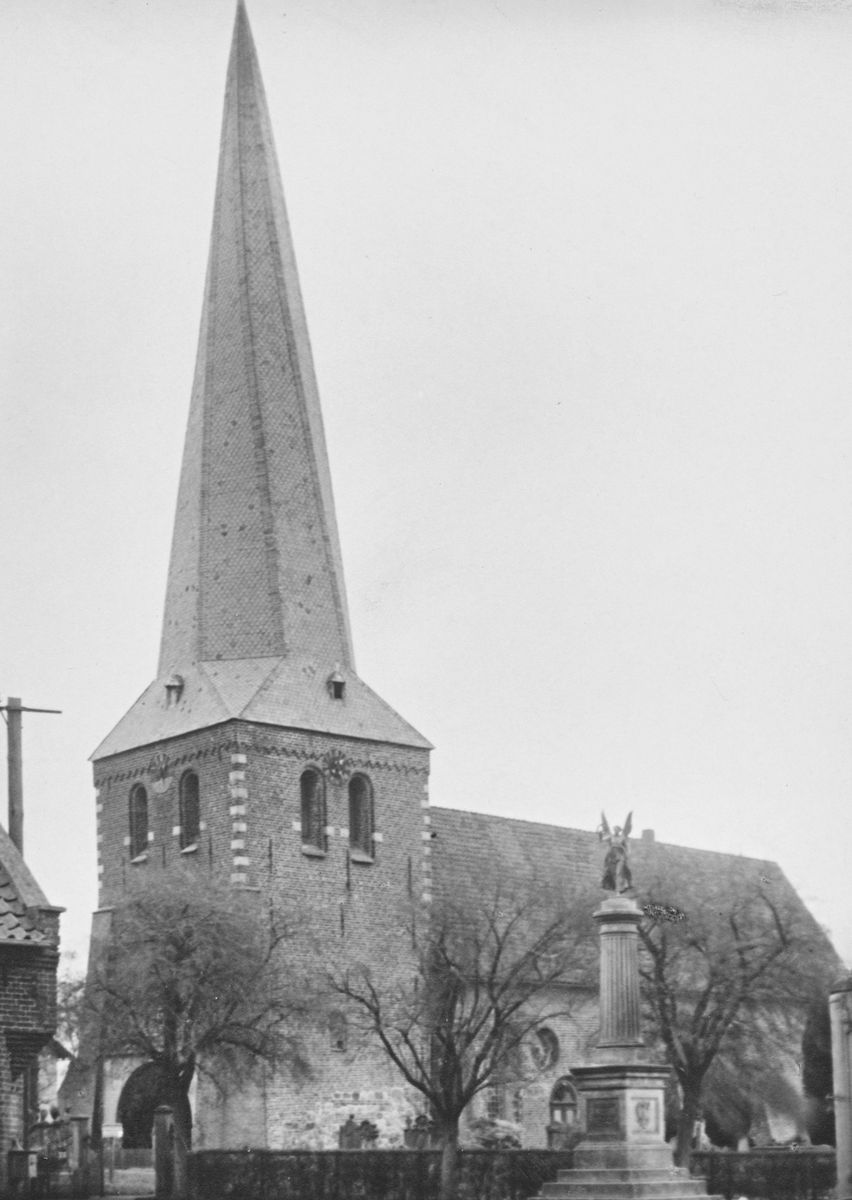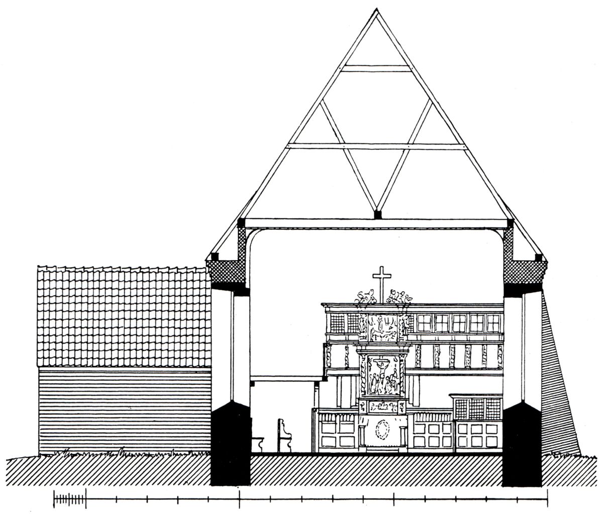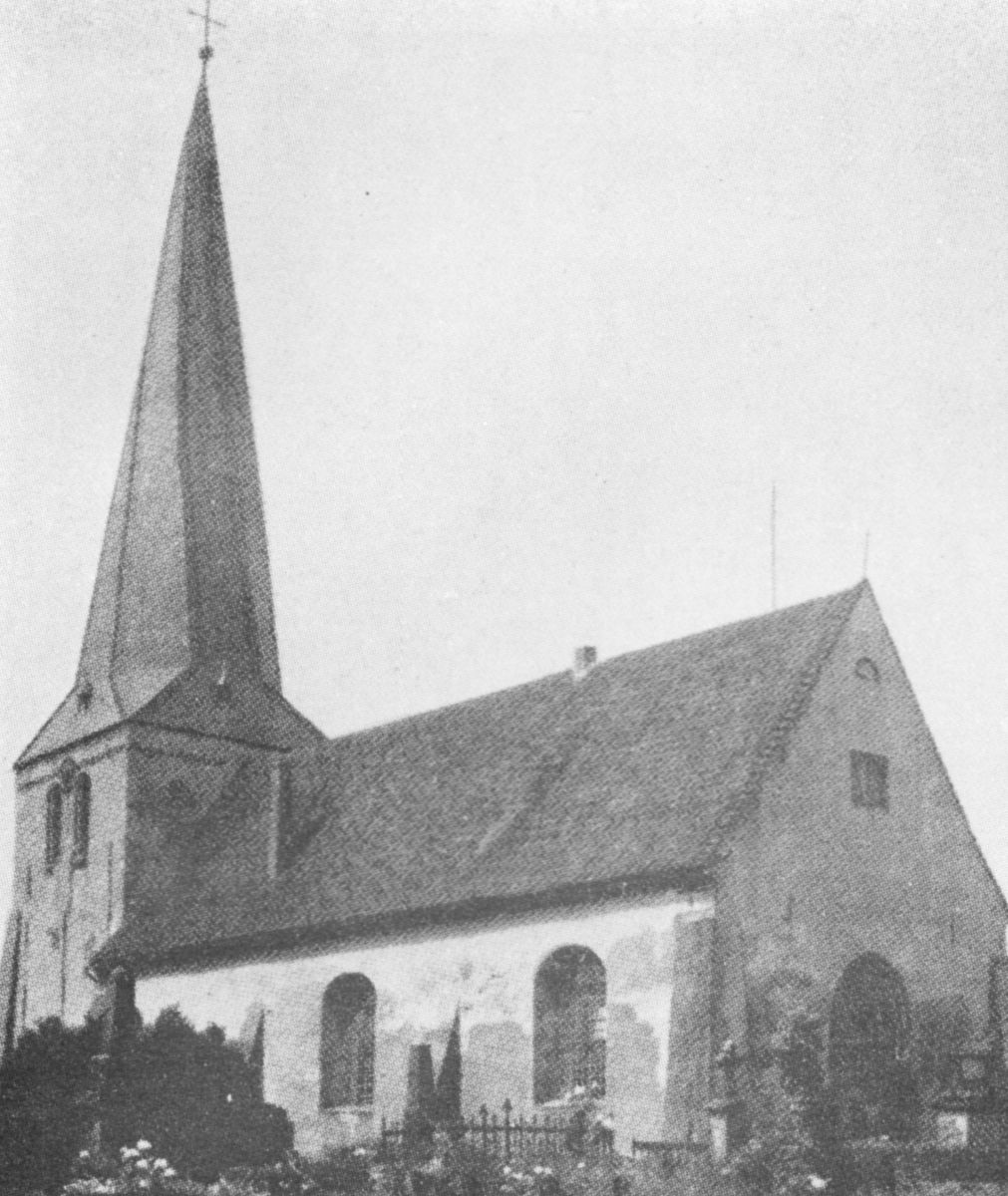 Saalbau mit rechteckigem Chor und Anbau an der Nordseite, im Kern 1420, Außenmauerwerk erneuert 1609–13. Satteldach. Backsteinmauerwerk, einige Quadersteine, Stützpfeiler. Korbbogige Sprossenfenster an den Längsseiten, breites Spitzbogenfenster nach Osten. Spitzbogige Portale nach Norden und Süden. Im Innern flache Decke mit seitlichen Vouten, u-förmige Westempore mit kurzen Seitenflügeln. An Nord- und Ostwand mittelalterliche Ausmalungsreste (erste Hälfte 15. Jh., 1912 teilweise freigelegt, 1938/39 freigelegt, 1961 restauriert, 1981 restauriert, ab 1997 gesichert), an der Ostwand die Heilige Sippe und Maria als Himmelskönigin, an der Nordwand Petrus mit Schlüssel und Buch sowie Steinigung des Stephanus.53 In der nördlichen Ostwand Tabernakel, Piscina und liturgisches Ostergrab (2000 freigelegt).54 1580/81 Reparaturarbeiten, Dach neu gedeckt, Vorbauten vor den beiden nördlichen Eingängen errichtet.55 1607–11 grundlegende Instandsetzung, Außenmauerwerk neu aufgemauert, Innenraum umgestaltet. 1673 Westempore für die Orgel erbaut (Zimmermann Johann Moller). 1682 Nordempore erbaut (Zimmermann Johann Moller). Um 1800 Decke erneuert, Stützpfeiler am Schiff errichtet. 1852 bemalte, mittelalterliche Decke mit verputzter Voutendecke ersetzt, Fenster vergrößert, Außenmauern erhöht. 1893/94 hölzerne Emporenstützen durch gusseiserne ersetzt. 1938/39 Renovierung, u. a. Nordempore und Ostempore abgebrochen (wegen Wandmalereien); Wandmalereien freigelegt, restauriert und ergänzt (Heinrich Bücker, Hannover); Westempore verändert neu errichtet; Außenputz entfernt. 1962/63 Innenrenovierung, u. a. Westempore umgestaltet, Altarretabel umgestaltet („Die Einrichtung stellt sich heute als historisierendes Konstrukt des 20. Jahrhunderts dar“56). 1999–2001 Innen- und Außenrenovierung, u. a. Sicherung der Wandmalereien.