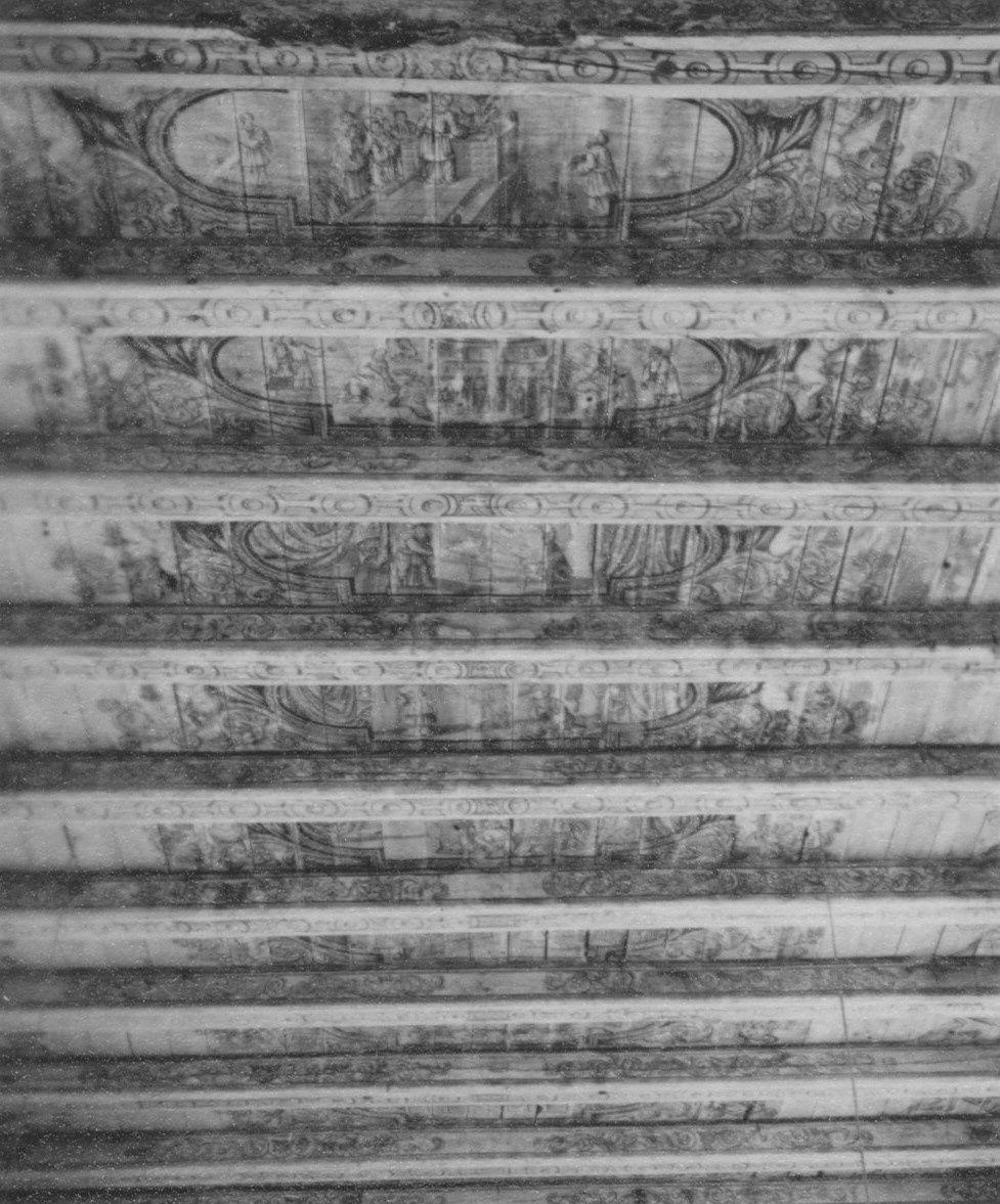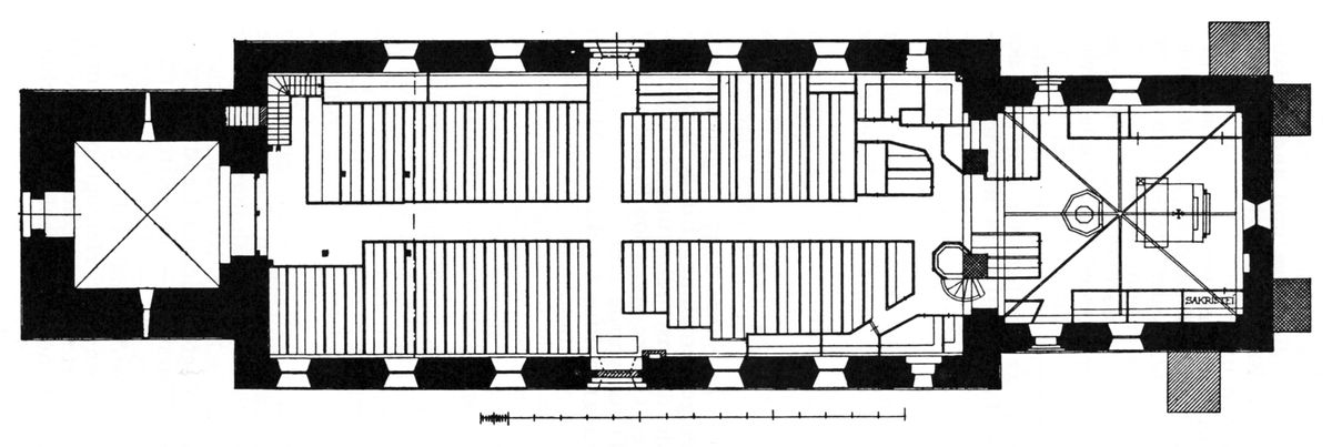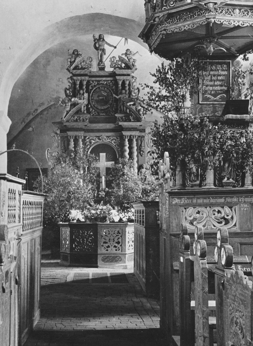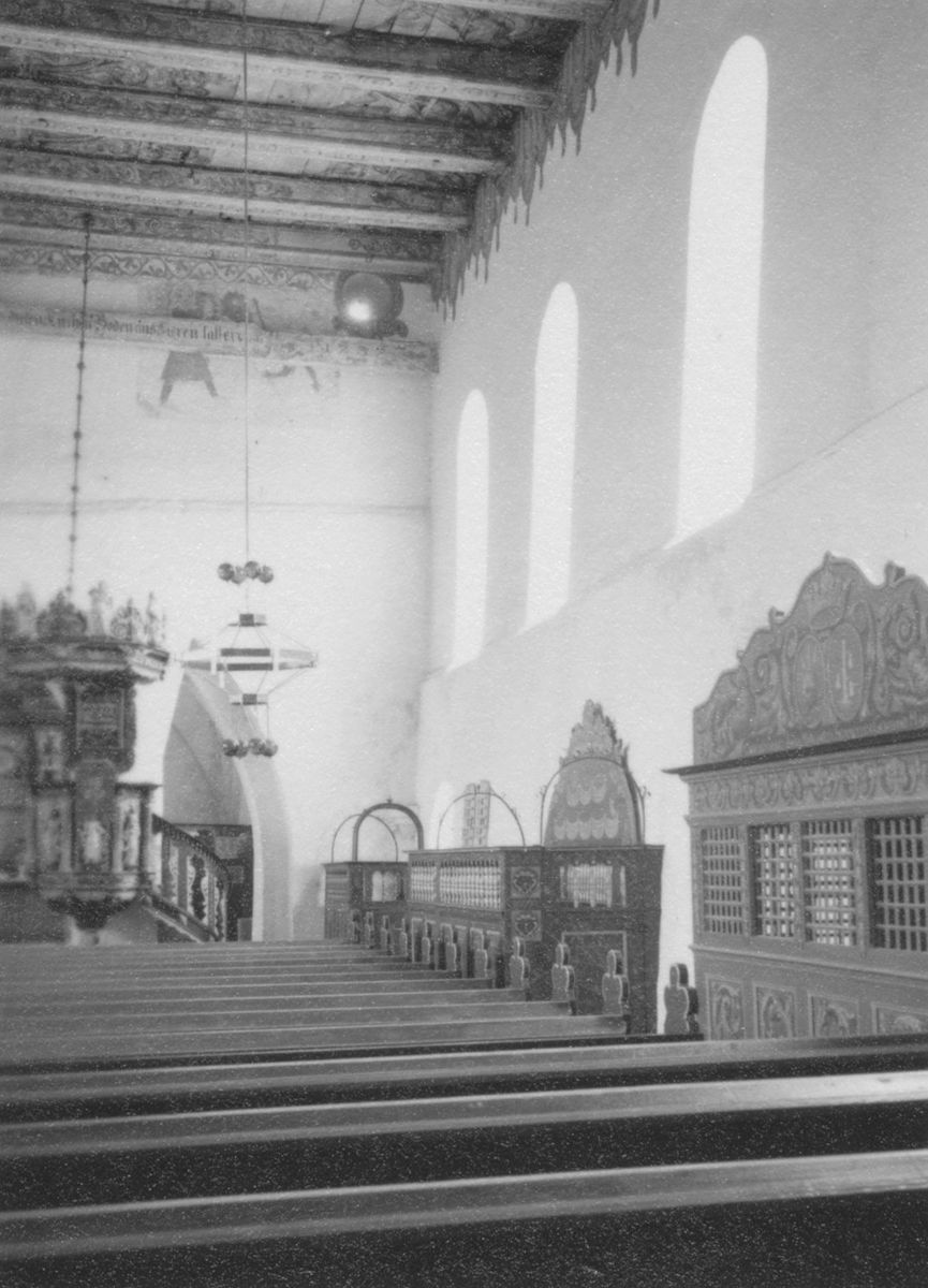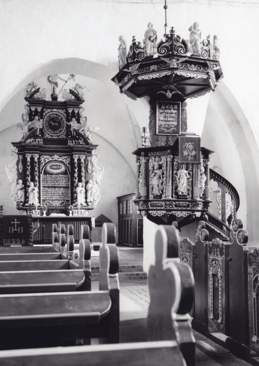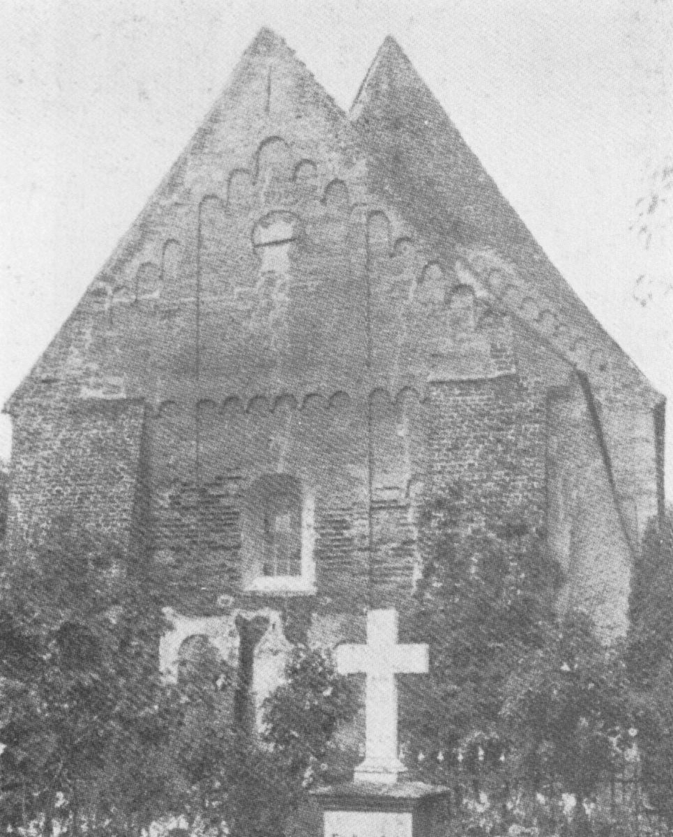 Rechteckiger Saalbau mit eingezogenem Quadratchor, erbaut im ersten Viertel des 13. Jh.43 Satteldächer. Mauerwerk überwiegend aus Tuffsteinen, Lisenen und rundbogiger Trauffries an Schiff und Chor. Rundbogige Fenster, zwei Kreisfenster in Ostwand des Schiffs, ein Kreisfenster im Chorgiebel. Rundbogenportale nach Norden und Süden, Nebenportale an Nord- und Südseite des Chors. Im Innern flache, bemalte Balkendecke im Schiff (1737, 13 biblische Szenen: Gesetzgebung, Stiftshütte, Tempel Salomos, Bundeslade, Räucheraltar, Siebenarmiger Leuchter, Schaubrote, Ehernes Meer, Brandopfer, Manna (?), Beschneidung, Passahlamm, Christus mit Inschrift: „Christus ist des Gesetzes Ende, wer an ihn glaubet, der ist gerecht“; gemalter Fries als Übergang zwischen Decke und Wand), Kreuzgewölbe im Chor; in der Ostwand Chorbogen mit eingestelltem, runden Stützbogen; Westempore. Fünf Ausmalungsrest an Nord-, Süd- und Ostwand des Schiffs, sowie an Ostwand des Chors (1928 erwähnt, freigelegt 1930, 1959 und 1980), an Ostwand des Schiffs wohl Samsons Löwenkampf (erstes Viertel 13. Jh.), an Nordwand des Schiffs Kreuzigung, an Südwand des Schiffs Jesaja und weitere Heilige oder Propheten (um 2010 übertüncht), an Ostwand des Chors vielleicht Dreifaltigkeit oder Taufe Jesu sowie männlicher Kopf, vielleicht Kg. David (alle zweite Hälfte 16. Jh.).44 Vielleicht schon im 13. Jh., vielleicht erst im 15. Jh. Stützbogen im Chorbogen erbaut. Um 1500 steilere Dächer über Schiff und Chor erbaut, Südwand neu verblendet (Backstein), Stützpfeiler an Ostwand erbaut. Wohl um 1700 Stützpfeiler an Nord- und Südecke der östlichen Chorwand erbaut. 1707 Südseite erneuert. 1737 Decke bemalt (Inschrift: „Aus freywilligem Hertzen zur Ehre Gottes hat Siade Peckes diesen Kirchen-Boden auszieren lassen Anno 1737“. 1774 Westempore erbaut. 1864 Neubau der Westempore, Teil der älteren Empore wiederverwendet. 1895 Fenster tiefergelegt und vergrößert. 1957–59 Renovierung und Umgestaltung Innenraum.45 1978 Decke renoviert. 1985 Reparaturen am Chor, u. a. Stützpfeiler entfernt. 2001–07 Gesamtsanierung, u. a. statische Sicherung, Dachstuhl erneuert, Außenmauerwerk der Südseite in Tuffstein erneuert, Innensanierung.