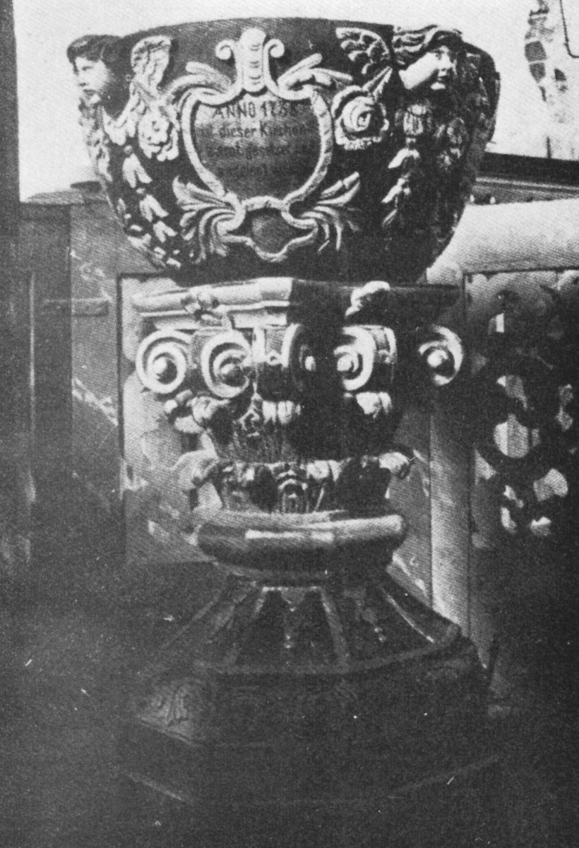 Mit einem neuen Altar (1709), der Deckenbemalung (1737) und der neuen Taufe (1738) hatte der Innenraum der Wremer Kirche in der ersten Hälfte des 18. Jh. ein neues Aussehen erhalten. In die gleiche Zeit fiel 1737/38 die Stiftung einer Pfarrbibliothek: Zum „ewigen Gedächtniß der seeligen viel Ehr und Tugend begabten Frauen Wittwe Hille Eggers gebohrne Lübs“ erhielt die Gemeinde Wremen 1737 insgesamt 50 Reichstaler, um aus deren Zinsen Bücher anzuschaffen.28 Die Schriften sollten der Gemeinde Wremen „das evangelische, apostolische und apokalyptische Licht und Recht“ vermitteln.29 Ein Jahr später ließ die Gemeinde hinter dem Altar einen Bücherschrank aufstellen, der die Bibliothek aufnehmen sollte. Bis 1892 war sie auch 625 Bände angewachsen (2004 noch 500 Bände vorhanden). Im ersten Jahrzehnt des 20. Jh. zählte die Gemeinde Wremen knapp 1.030 Gemeindeglieder.30 Nach Beginn des Ersten Weltkriegs verlor der Wremer Kirchturm seine Spitze: Das Militär ließ ihn abbrechen, damit er „den Engländern nicht als Seezeichen“ dienen konnte. Der Wiederaufbau erfolgte erst 1930.31